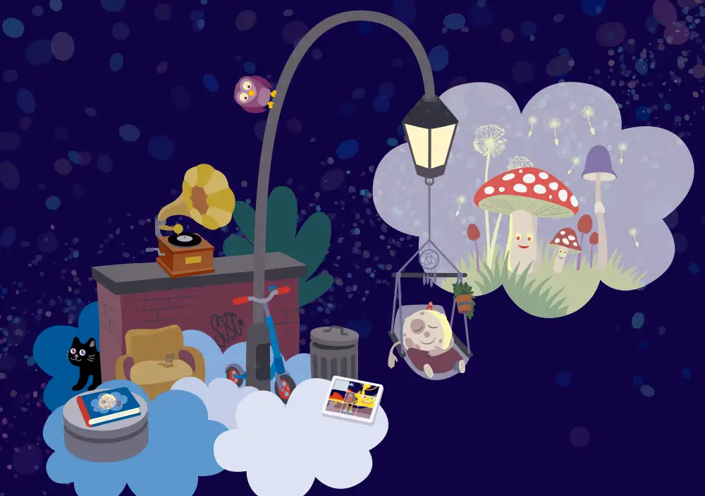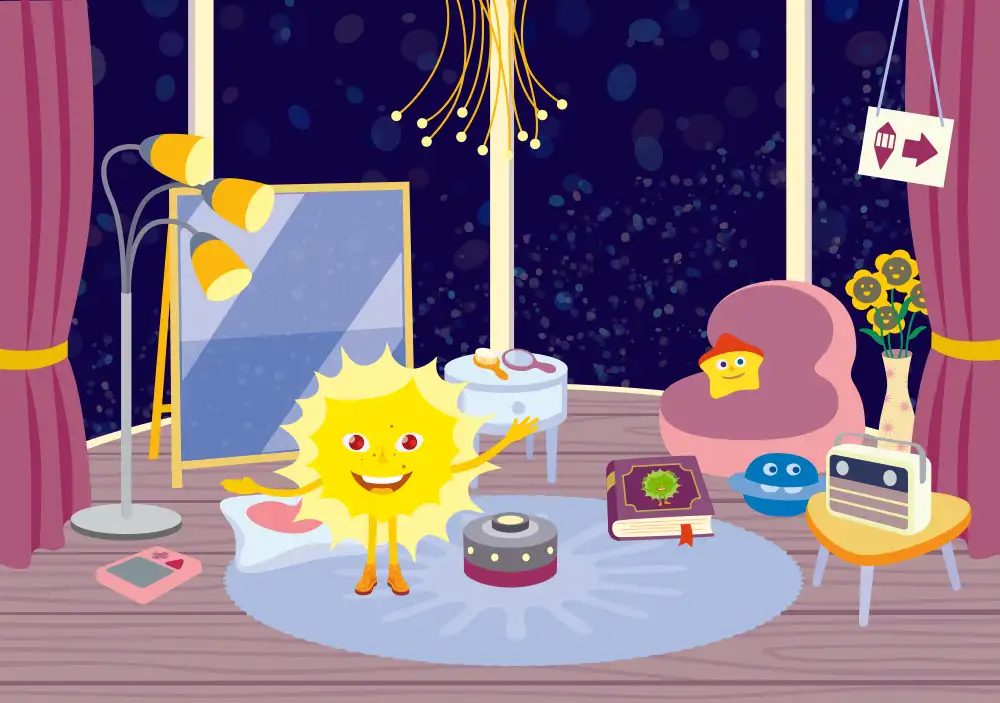 Besucht das Baumhaus vom Kleinen Stern und Sternschnuppe, schaut beim Wind auf dem Weltraumschrottplatz vorbei oder erkundet die Milchbar der Erde. Es gibt viel zu sehen: das Milchshake-Teleskop des Grünen Planeten, den Leuchtturm der Sonne, die Pendeluhr der Wolke 7 oder die Schlafwolken des Mondes.